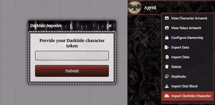 - Once activated, create a new Agent type Actor. Once created, right click the Actor in the sidebar and click Import Darktide Character. Then paste your export token.