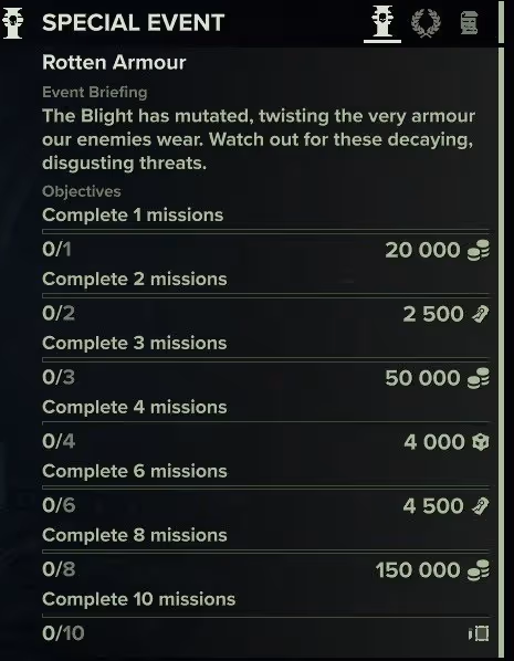 To make progress in the event, complete missions with the Rotten Armour condition. This goes for any combination of Rotten Armour and other modifiers that are available, such as Rotten Armour and Hunting Grounds, Rotten Armour and Pox Gas and more.