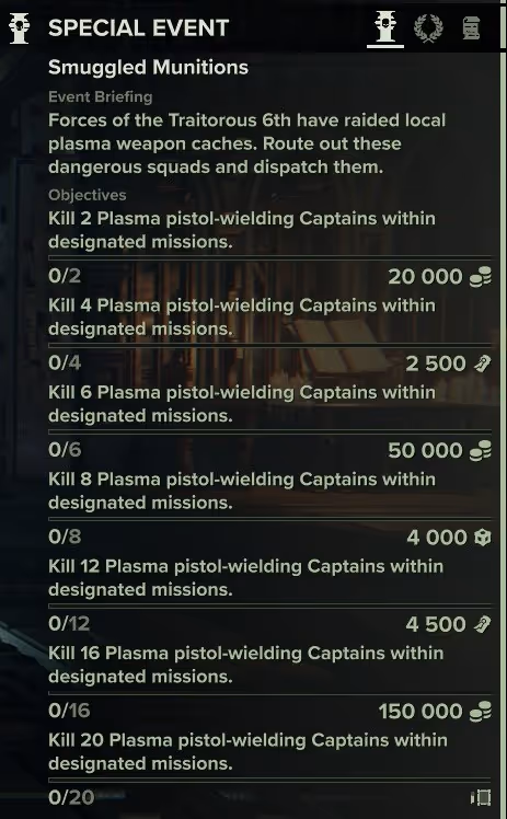 This event is LIVE NOW, until October 13. The rewards will be Ordo dockets, Plasteel and Diamantine. Those who complete the last tier of the event will receive a cosmetic portrait frame.